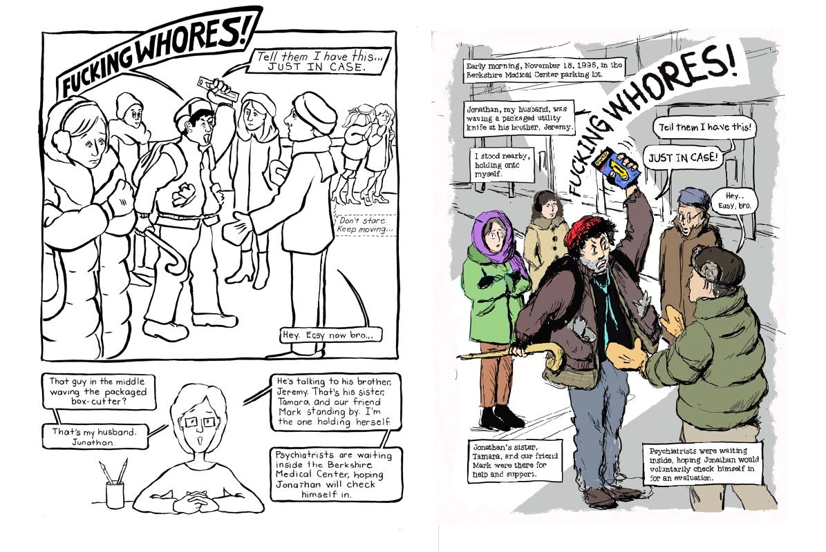 I have a hunch that back then I must’ve just read Art Spiegelman’s “Maus”, and thought it was cool that instead of caption boxes, he drew himself at his drawing table as the narrator. Well, putting himself in his book, the only human character where everyone else was either a mouse or a cat or a pig, was brilliant. However, my memoir is populated with a multidude of human characters (it took a village). Having two Lynn characters (the narrator, and the one living the experience back then) was not such a good idea.