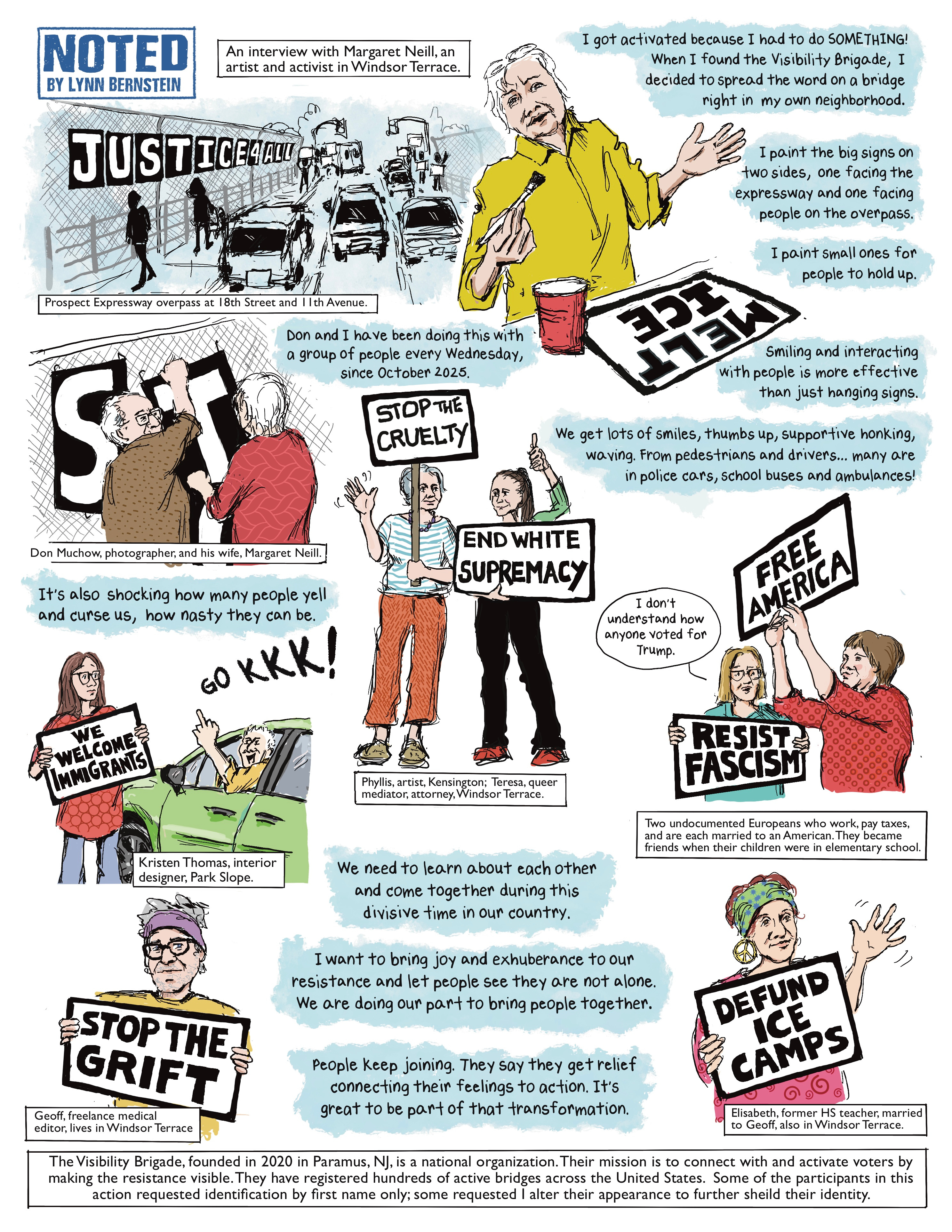 Instead, I pitched the idea of doing a page on the resistance, featuring local people who are involved in upholding community values, people and organizations that are defending our institutions, something upbeat and proactive. It could be both informative and reassuring for readers to know that there are groups of people in the neighborhood who are actively resisting. Doing it as comic reportage also offers the option of anonymity to people who do not want to be identified. Photographs are very specific to the people photographed, the iconography of comics allows the reader to identify with the characters. And perhaps inspire them to get involved.